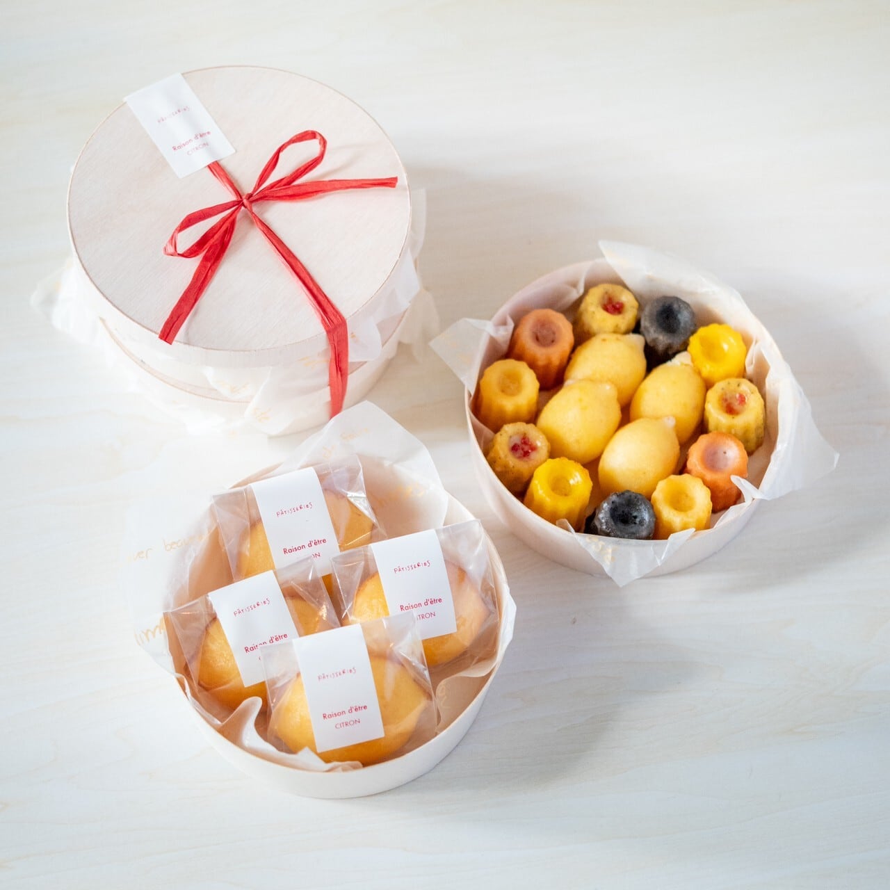 一番人気のレモンケーキグランデ4pcsの丸ワッパとプチレモンケーキアソート15pcsの入った丸ワッパを2箱重ねてお重ギフトのようなかわいいラッピングで仕上げました。